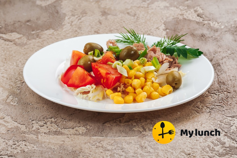 кукуруза консервированная, свекла, морковь, пекинская капуста, укроп, соевый соус, растительное масло, сок лимона