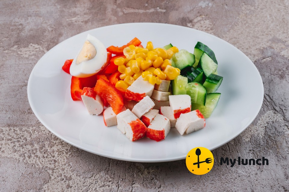 Ветчина,маринованные огурчики,салат Айсберг,кукуруза консервированная,чеснок,Заправка для салата(горчица зернистая,майонез)