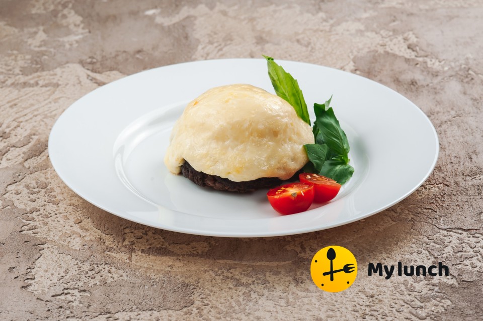 шампиньоны, соус Бешамель, лук репчатый, сыр